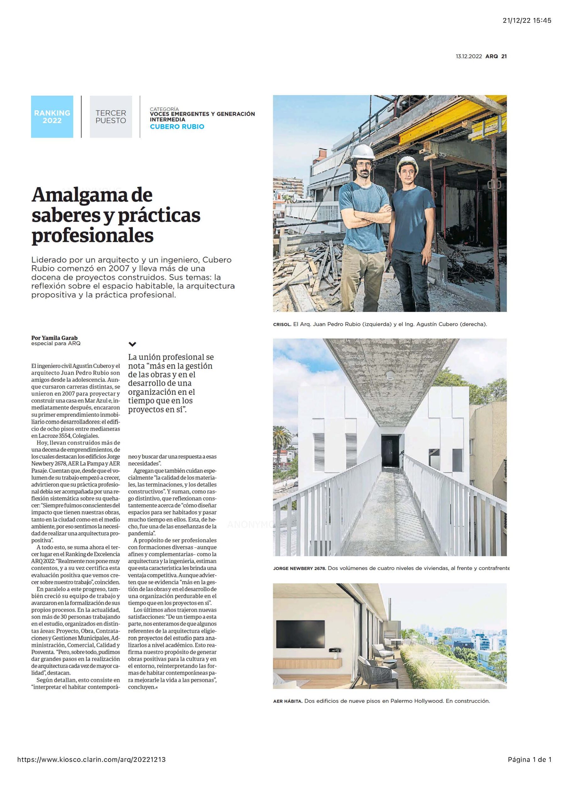 El suplemento ARQ de Clarín publicó los resultados de la edición 2022 del Ranking de Excelencia Profesional, en el que Cubero Rubio fue distinguido con el 3° puesto en la categoría “Voces emergentes y generación intermedia”.